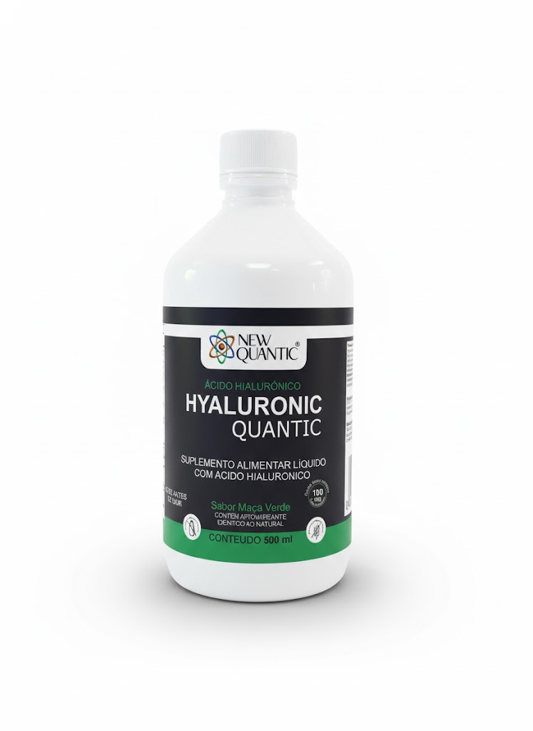 Hyaluronic Quantic é um suplemento alimentar líquido com Ácido Hialurônico. Embalado em frascos de 250ml no sabor de Maçã Verde, cada dose de 15 ml. do produto contém Vitaminas A, B3, B6, C, D, E e Zinco, além de fornecer 100mg de Ácido Hialurônico.