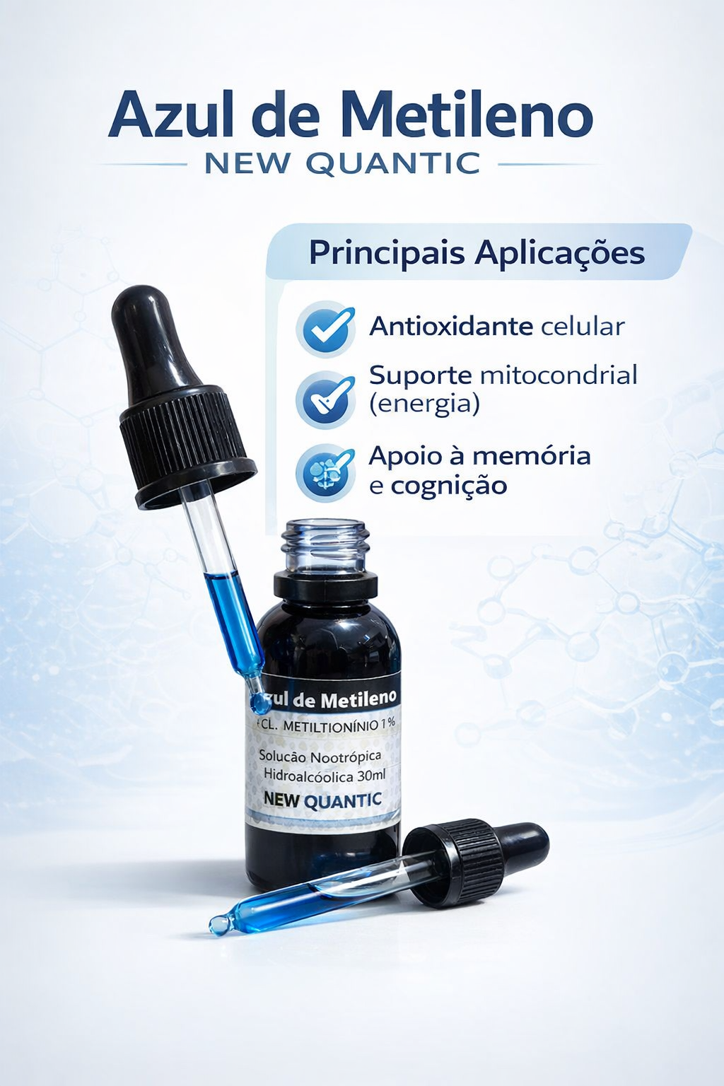 Principais Aplicações e Benefícios: Saúde e Medicina: Atua como antídoto para metemoglobinemia, tem propriedades neuroprotetoras, melhora a memória e função cognitiva, e auxilia na disfunção mitocondrial. Uso Clínico: Utilizado em procedimentos endoscópicos para identificação de tecidos (coloração). Aquarismo: Utilizado para tratar fungos, parasitas e infecções bacterianas em peixes. Química: Age como indicador de pH e oxidação-redução.